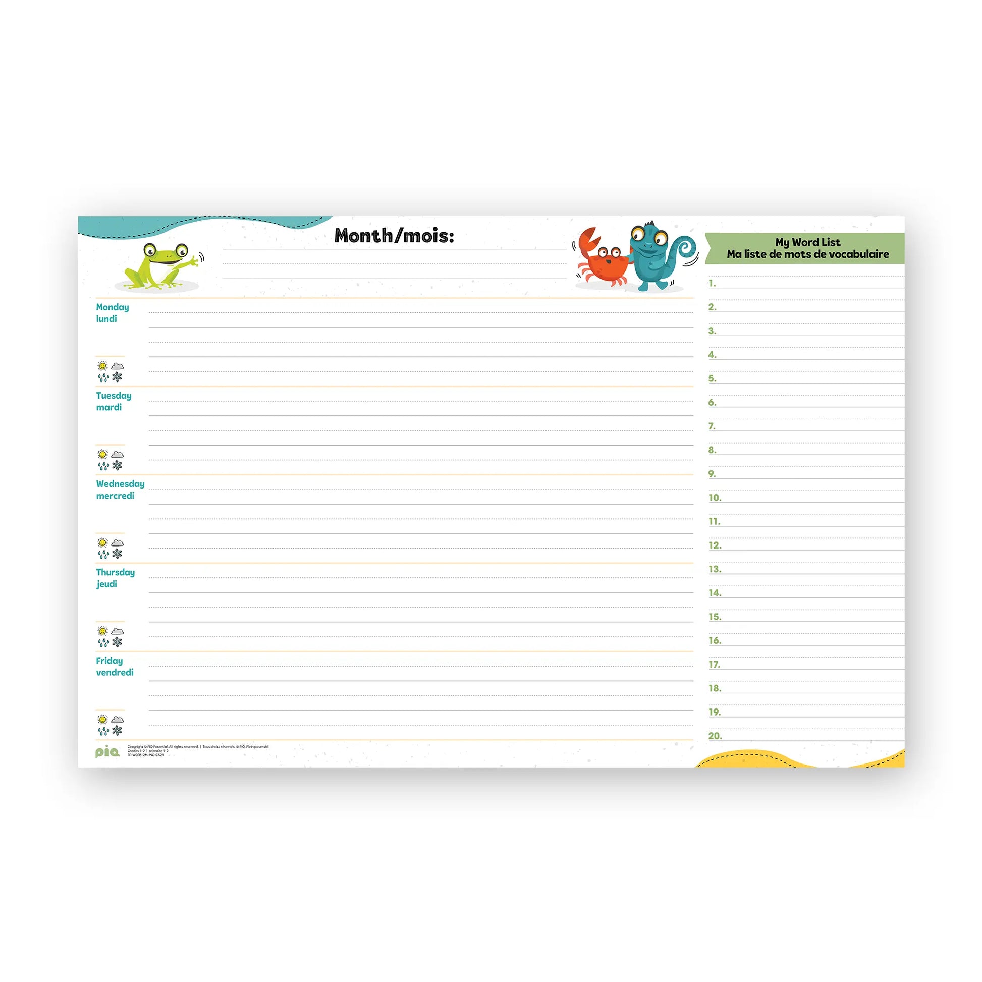 Calendrier mural effaçable à sec bilingue pour les élèves de 1re et 2e année du primaire.
