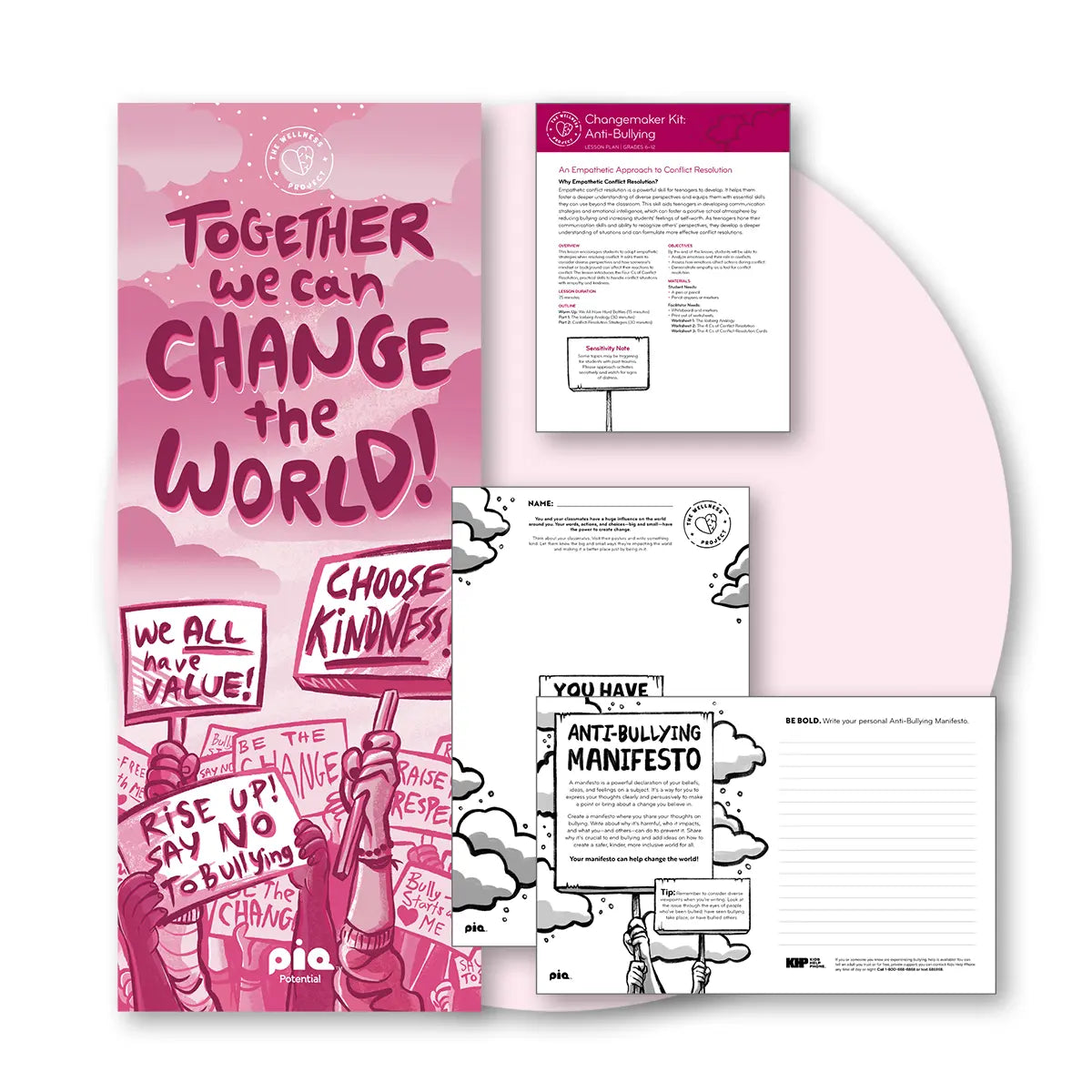 Planning impactful events can be time-consuming and costly! Our Changemaker: Anti-Bullying Kit is packed with engaging visuals, activities, and learning tools to make hosting a memorable event cost-effective, hassle-free, and fun.