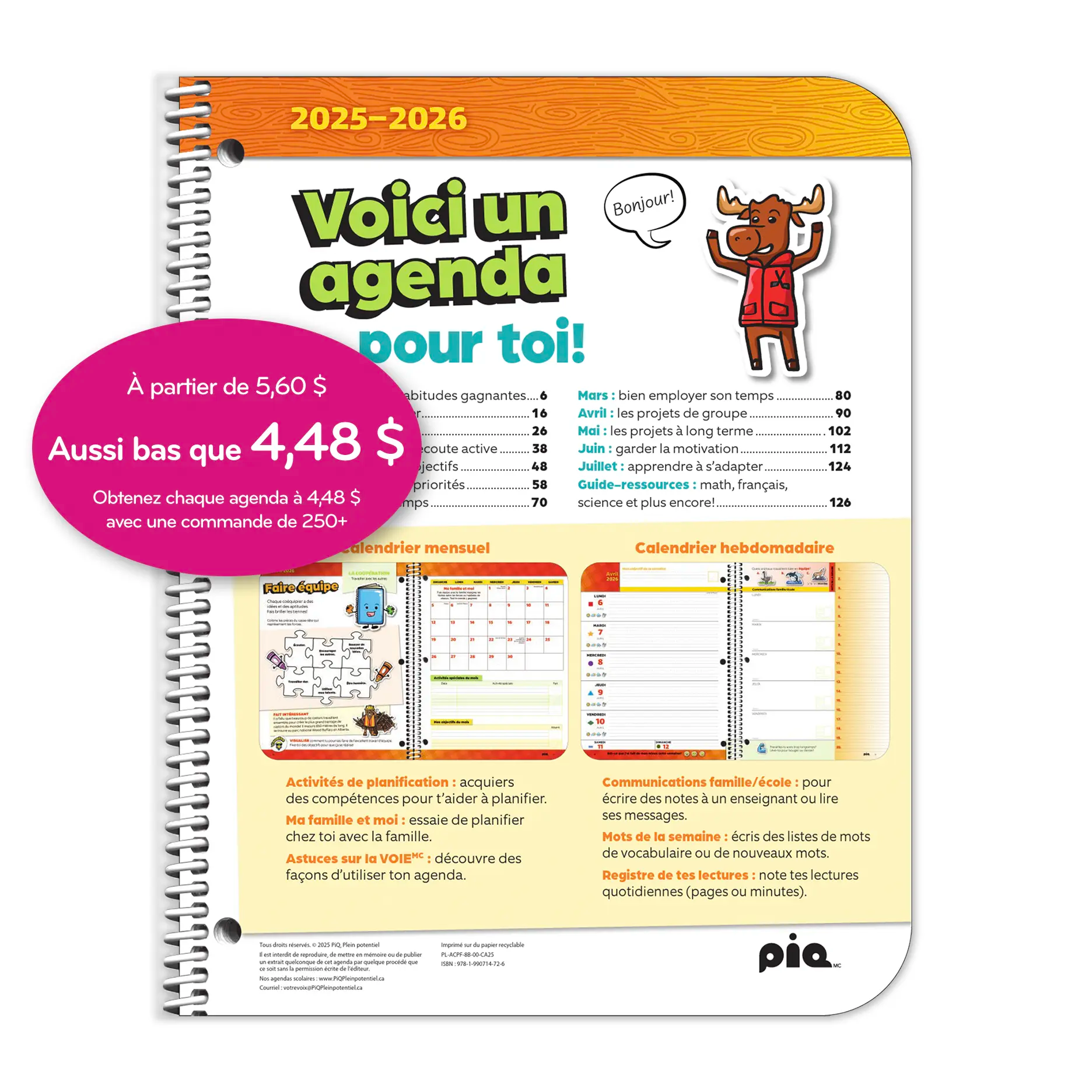 Les agendas scolaires sont disponibles en quantités de 25 ou plus. Si vous avez besoin de **1 000 agendas ou plus**, demandez un devis instantané, et un conseiller PiQ vous aidera. Pour les petites commandes de 1 à 10 agendas, veuillez choisir la version standard.