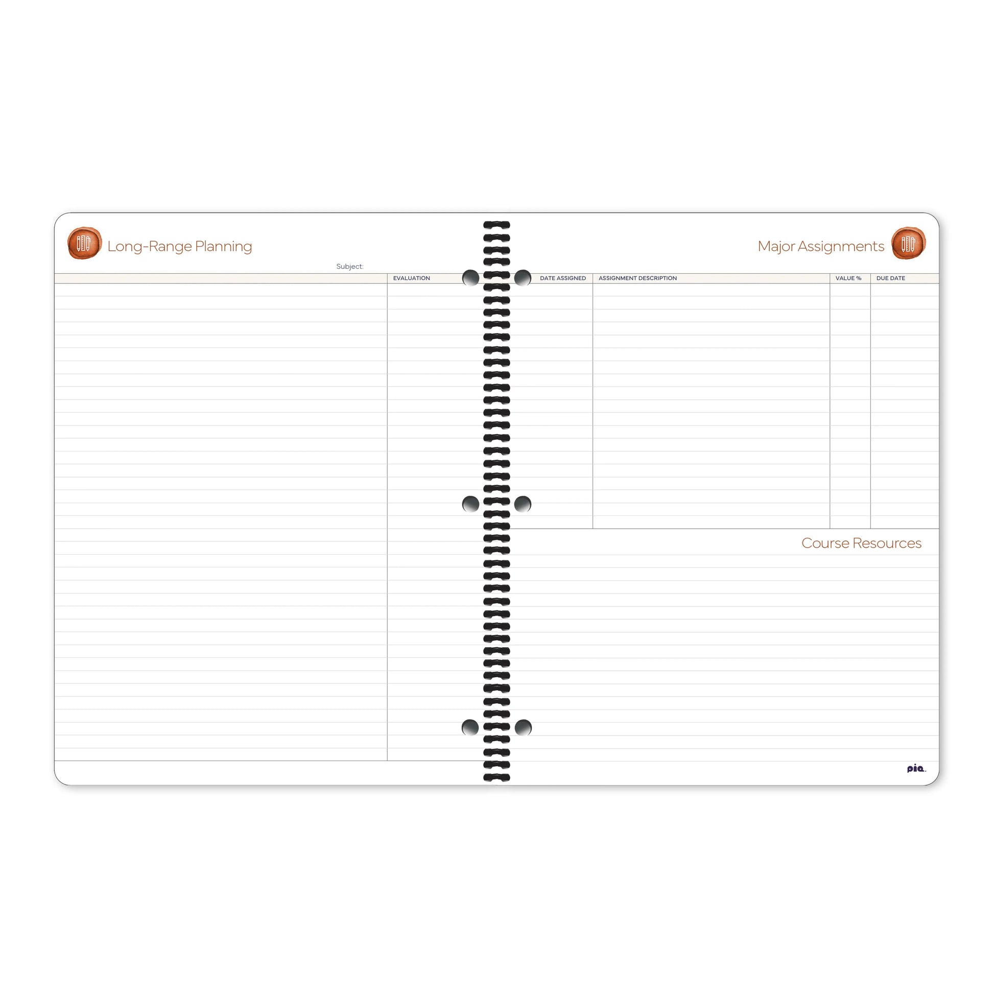 - Features long-range planning and major assignments sheets.